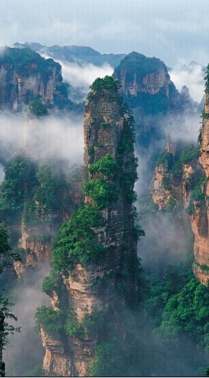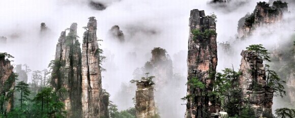 有時,山下細雨霏霏,山上卻晴空萬里 ;有時,山上云遮霧罩,山下卻陽光燦爛。美國好萊塢大片《阿凡達》中的懸浮山,吸引了全世界觀眾的眼球,其原型就是云海中的武陵源石英砂巖峰林。晴朗的清晨,一輪朝陽在五彩云霞簇擁下,從奇山異峰中冉冉升起 ;