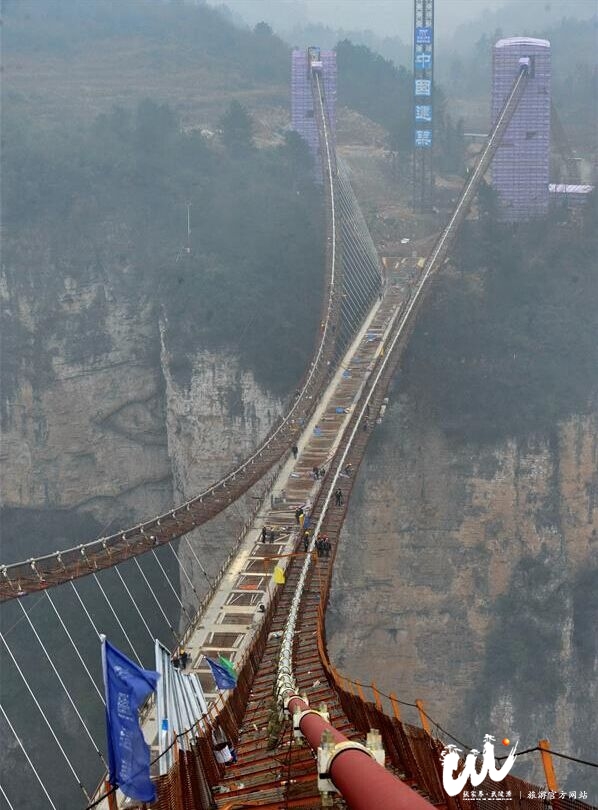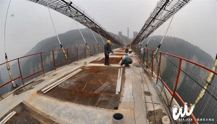 張家界·武陵源旅游官網(wǎng)1月19日訊 (新華社記者 龍弘濤)近日,備受關(guān)注的張家界大峽谷人行玻璃橋正加快橋面施工進度,計劃今年上半年建成并對外開放。張家界大峽谷人行玻璃橋總長430米、寬6米,橋面距離谷底相對高度約300米。橋面全部采用透明玻璃鋪設(shè),最大游客容量為800人。2015年12月,人行玻璃橋已成功合龍。