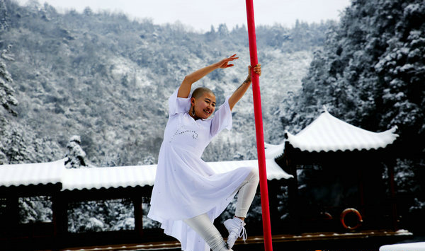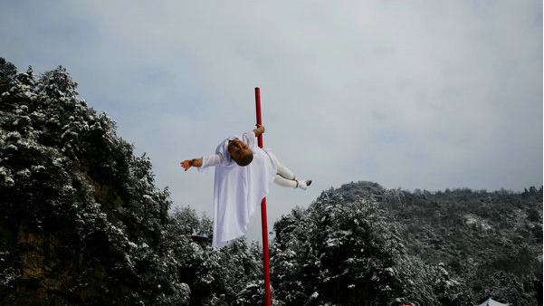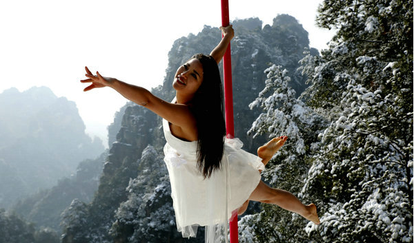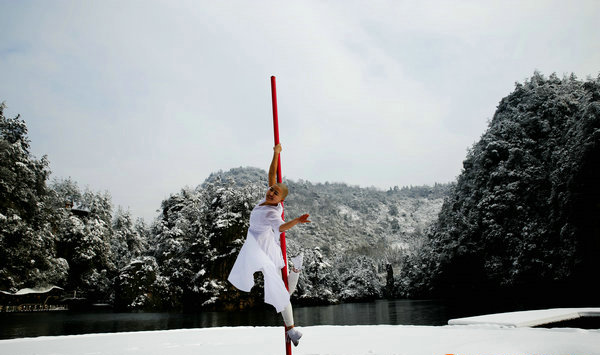 1月23日,韓國籍鋼管舞高級教練、第八屆中國鋼管舞錦標(biāo)賽冠軍金美娜率弟子湖南張家界武陵源寶峰湖景區(qū)上演鋼管舞秀,挑戰(zhàn)寒冬冰雪。吳勇兵攝