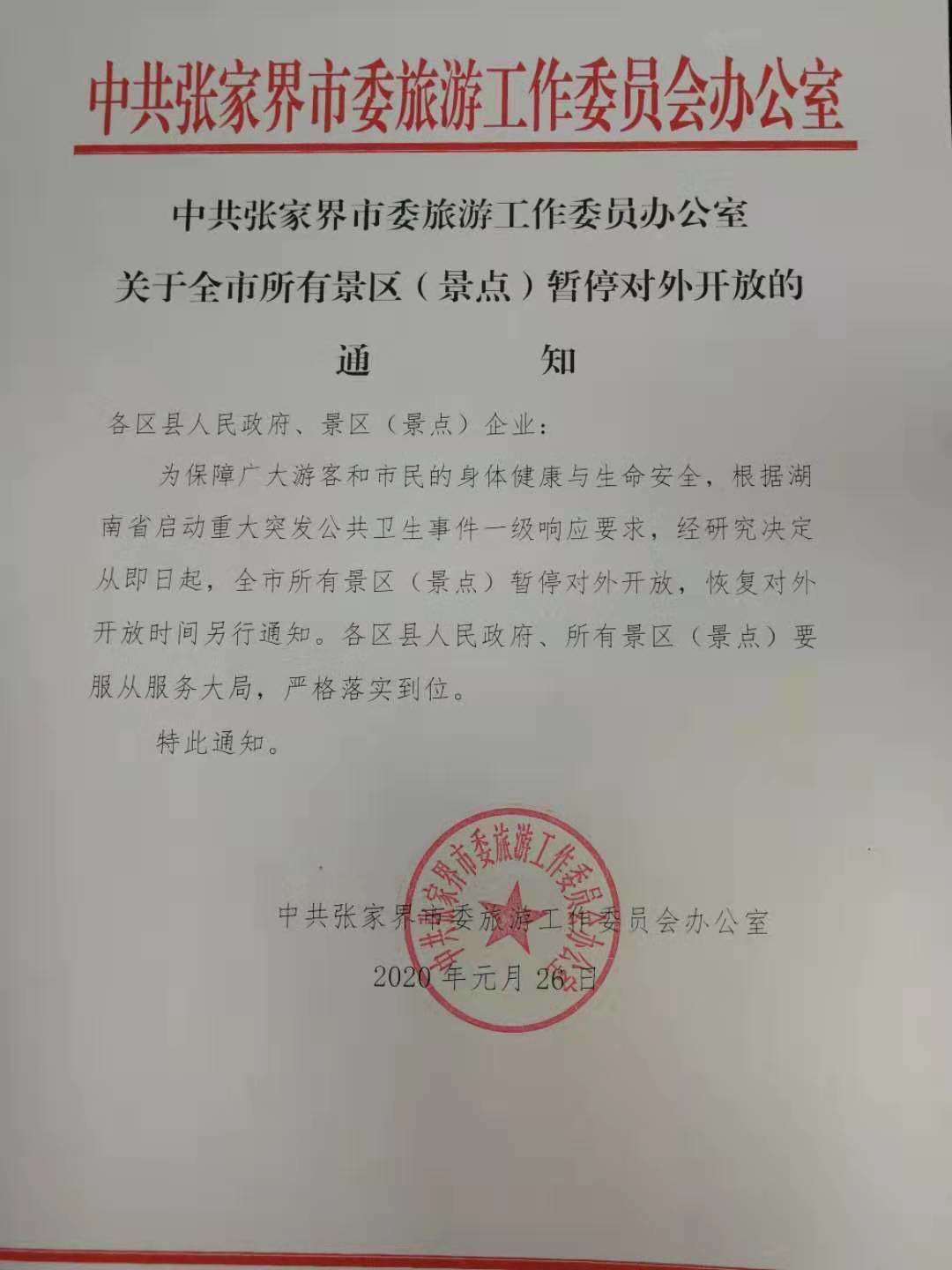為進(jìn)一步落實(shí)國(guó)家、省市重大公共衛(wèi)生事件一級(jí)響應(yīng)要求,全力做好文化旅游系統(tǒng)新型冠狀病毒感染和肺炎疫情防控工作,保障廣大游客和市民的身體健康與生命安全,根據(jù)中共張家界市委旅游工作委員會(huì)辦公室統(tǒng)一工作安排,張家界武陵源核心景區(qū)(張家界國(guó)家森林公園)、黃龍洞、寶峰湖等所有景區(qū)(景點(diǎn))自2020年1月26日起全部暫停對(duì)外開放,恢復(fù)對(duì)外開放時(shí)間另行通知。