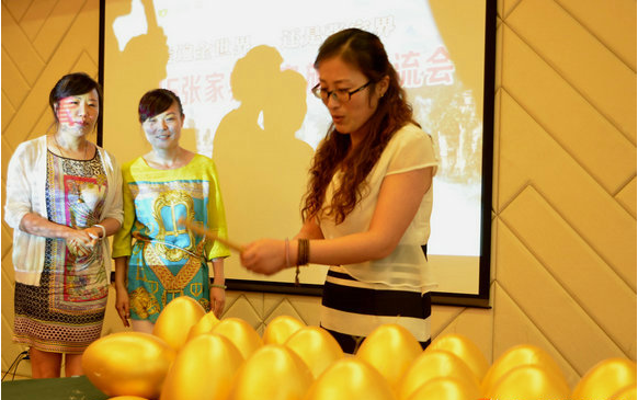 7月16日,張家界在青島舉行旅游產(chǎn)品推介會(huì)。圖為現(xiàn)場(chǎng)抽獎(jiǎng)砸金蛋