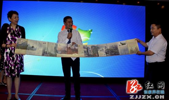 武陵源區(qū)人民政府副區(qū)長(zhǎng)萬齊坤向上海靜安區(qū)旅游局贈(zèng)送張家界風(fēng)光紀(jì)念冊(cè)(圖片來源紅網(wǎng))