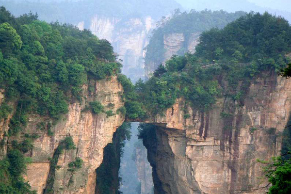 “天下第一橋”是張家界“十大絕景”之一。也是袁家界的標(biāo)志性景點(diǎn),它是居于兩山之間形成的一座天然石橋,而兩山原為一體,橋身是兩山相連的關(guān)鍵部分,但因中間石質(zhì)較為薄弱,由于風(fēng)化、崩塌作用的影響,又經(jīng)過(guò)日曬雨淋、流水洗刷、山洪沖擊,久而久之,終于形成今天這一特別的奇景。“ 天下第一橋”橋面寬兩米,厚四米,跨度為二十多米,高度為三百多米,是世界迄今為止所發(fā)現(xiàn)落差最高的天然石橋。