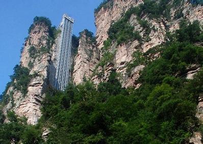 百龍?zhí)焯?,垂直高?35米,運(yùn)行高度326米,由154米山體內(nèi)堅(jiān)井和172米貼山鋼結(jié)構(gòu)井架等組成,采用三臺(tái)雙層全暴露觀(guān)光電梯并列分體運(yùn)行,每臺(tái)次載客50人次,運(yùn)行速度3米/秒,三臺(tái)同時(shí)運(yùn)行每小時(shí)往返量達(dá)4000人次。百龍?zhí)焯莸男藿▽?shí)現(xiàn)“山上游,山下住”的目標(biāo),提供了交通保障,將袁家界天下第一橋、迷魂臺(tái)、天懸白練以及烏龍寨、楊家界等絕世美景從幕后推向了前臺(tái),并將天子山、袁家界、金鞭溪等精品旅游線(xiàn)路連為一體,解決了多年困擾景區(qū)的交通瓶頸問(wèn)題。