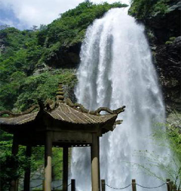 龍泉溪的盡頭,一懸崖高自余米,泉水自懸崖飛瀉,呈霧狀飄落谷底,形成瀑布。瀑高80米,上寬5米,下寬15米。左高55米懸崖處,有三節(jié)怪石凸出石壁,泉水跌落其上,形成煙霧,水汽氤氳。