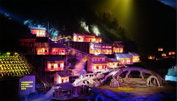 該劇由中國(guó)實(shí)景演出創(chuàng)始人梅帥元執(zhí)導(dǎo),享譽(yù)世界的華人音樂(lè)家譚盾擔(dān)任音樂(lè)總監(jiān),舞臺(tái)搭建于天門(mén)山下峽谷中,以落差一千多米的張家界天門(mén)山為背景,以山澗峽谷為表演舞臺(tái),1.2億巨資打造,500演員同臺(tái)傾情演繹。