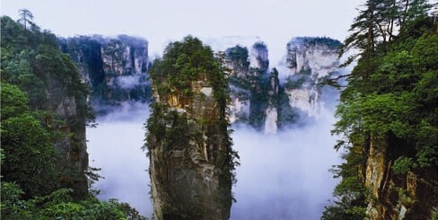 由袁家界東行約800米,有一小路蜿蜒南伸至兀巖頂平臺。置身平臺左右環(huán)顧、萬千景象盡收眼底。一座座巖峰石柱如桌、如椅、如樓、發(fā)閣、其形態(tài)奇異、妙不堪言。每當雨后初晴,時有輕云淡霧于群峰間飄浮、繚繞、但見山移峰潛,好似瓊樓玉閣,時隱時現(xiàn)。游人至此,個個神魂癡迷,不知居何處,故有迷魂臺之譽。