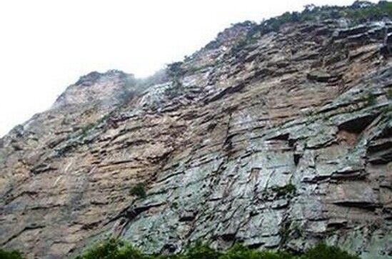 百丈峽景區(qū),插旗峪正中部右側有一面石壁,從溪邊騰空而起,通壁無掛,層理清晰,棱角分明,險峻雄渾,頂天立地,銳不可擋。石壁高約300m,長約800m。