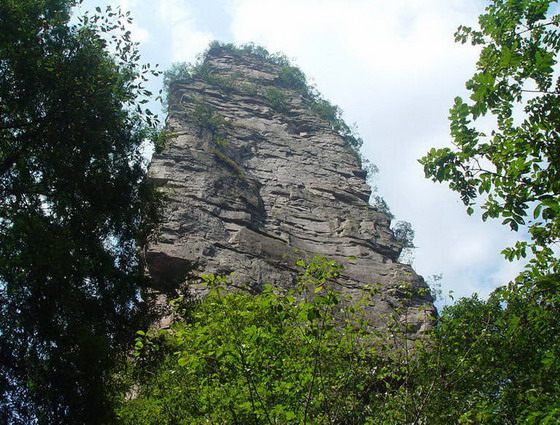 與金鞭巖隔溪對(duì)峙,矗立在斜坡上,高200余米。上下粗細(xì)一般,峰體渾圓,色赤,呈70度角向金鞭溪傾斜,形似一醉酒羅漢,欲倒不倒,似醉非醉,詼諧幽默。清嘉慶學(xué)士彭之臣在峰壁書寫一“忠”字。清道光四年(1824),貢生彭之運(yùn)作《壁忠記》一文以彰其勝。風(fēng)雨蒼桑,“忠”宇因山石崩塌遭毀,《記》存于當(dāng)?shù)刂緯小?